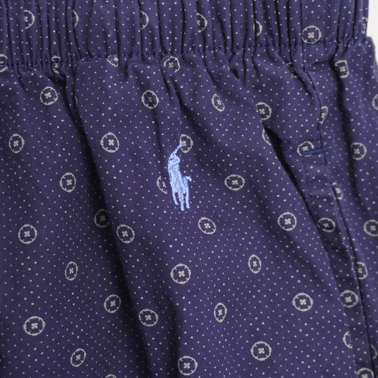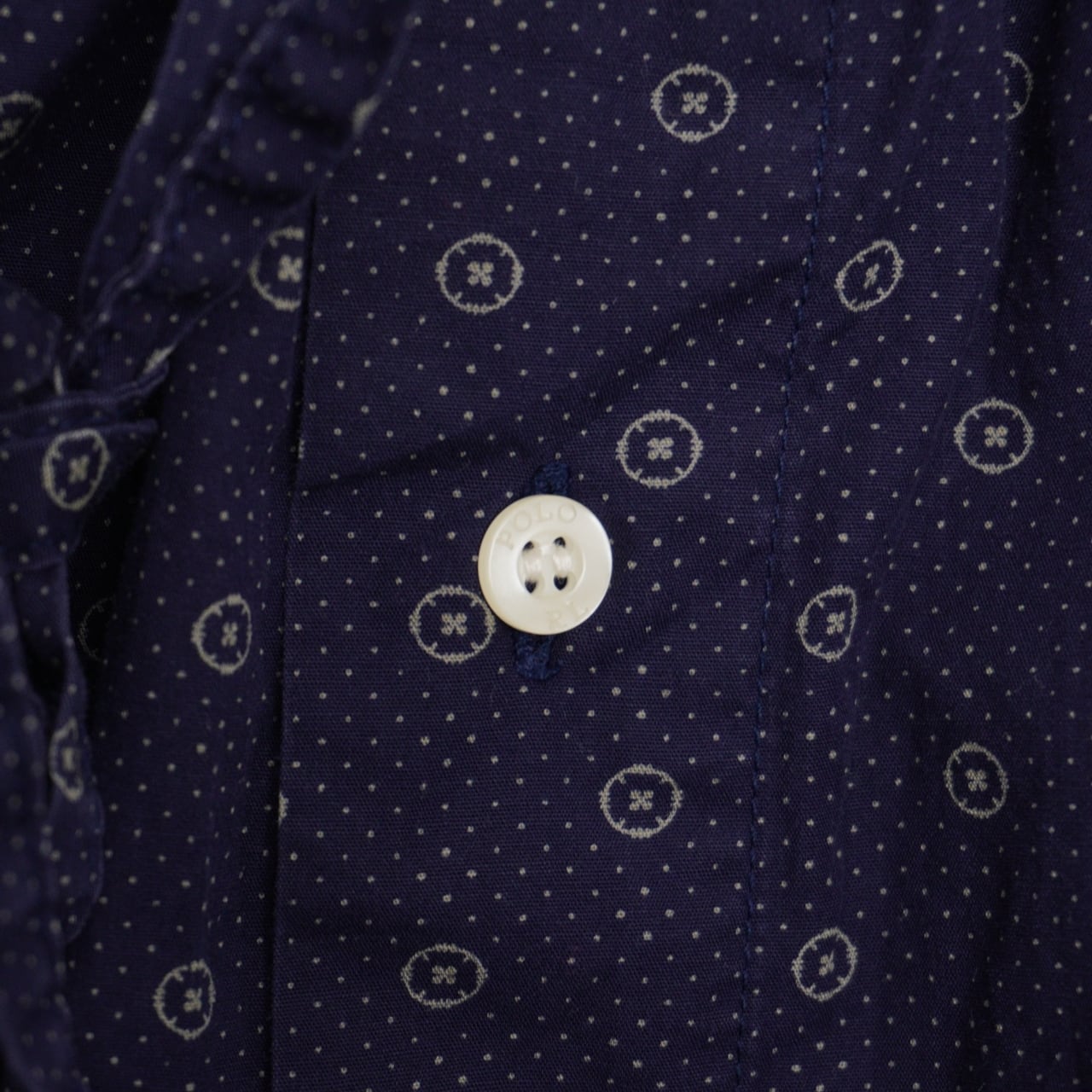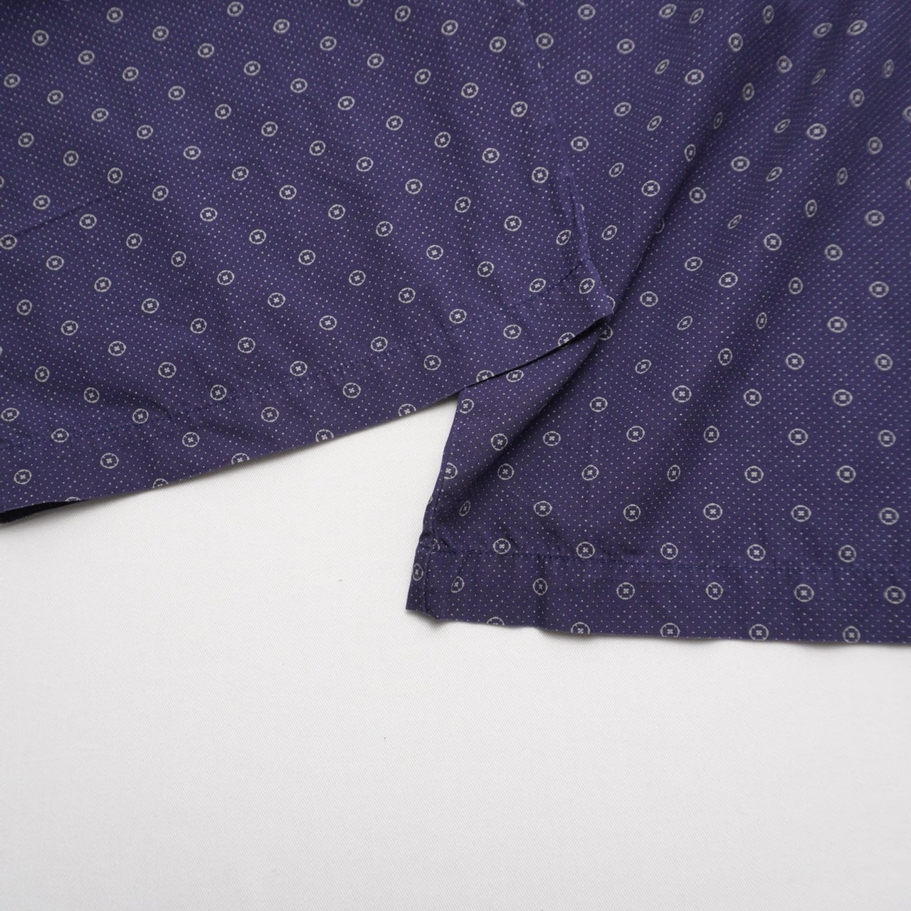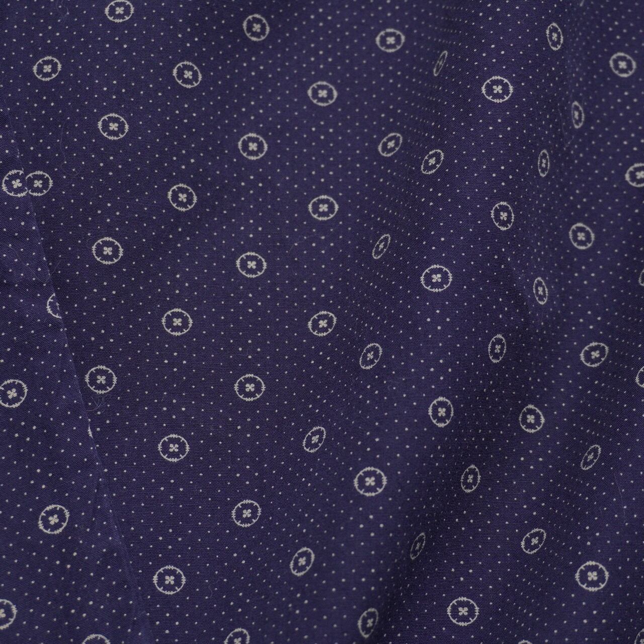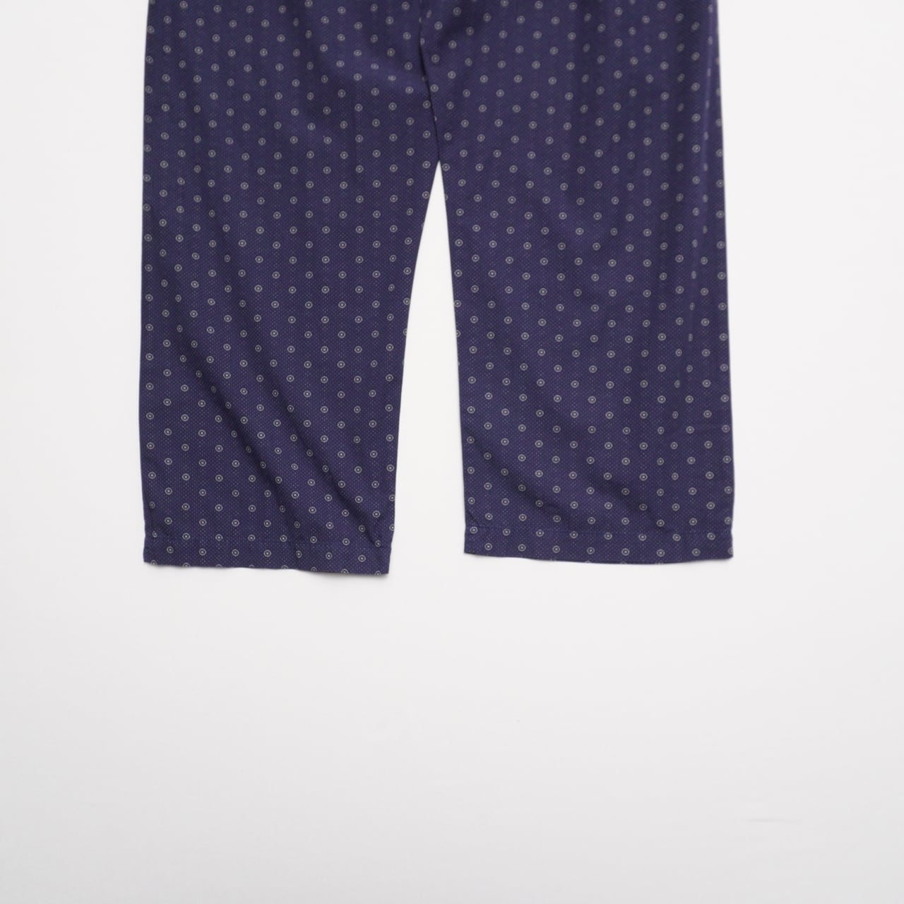 細かなボタンモチーフを散らした、小紋調の総柄パンツ。