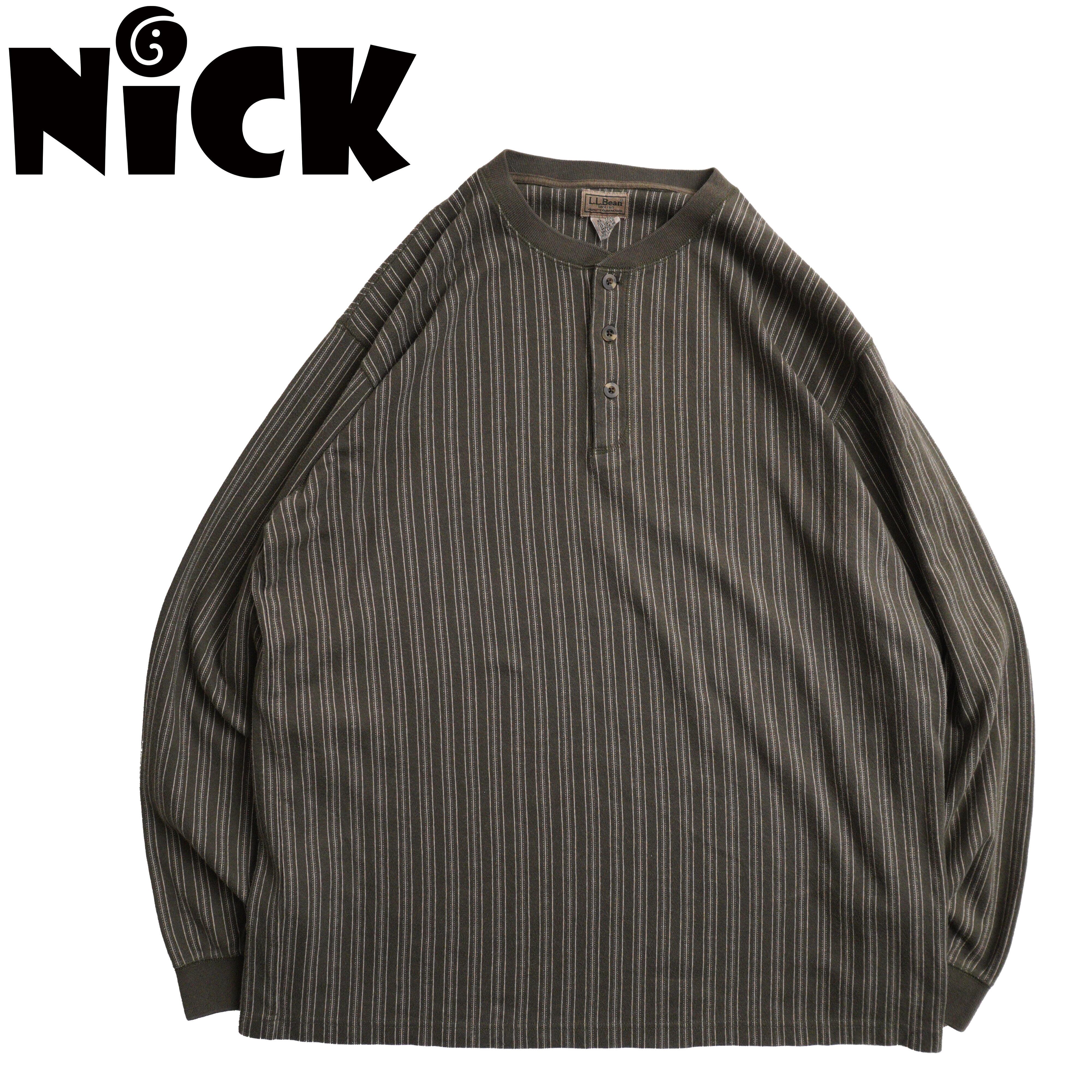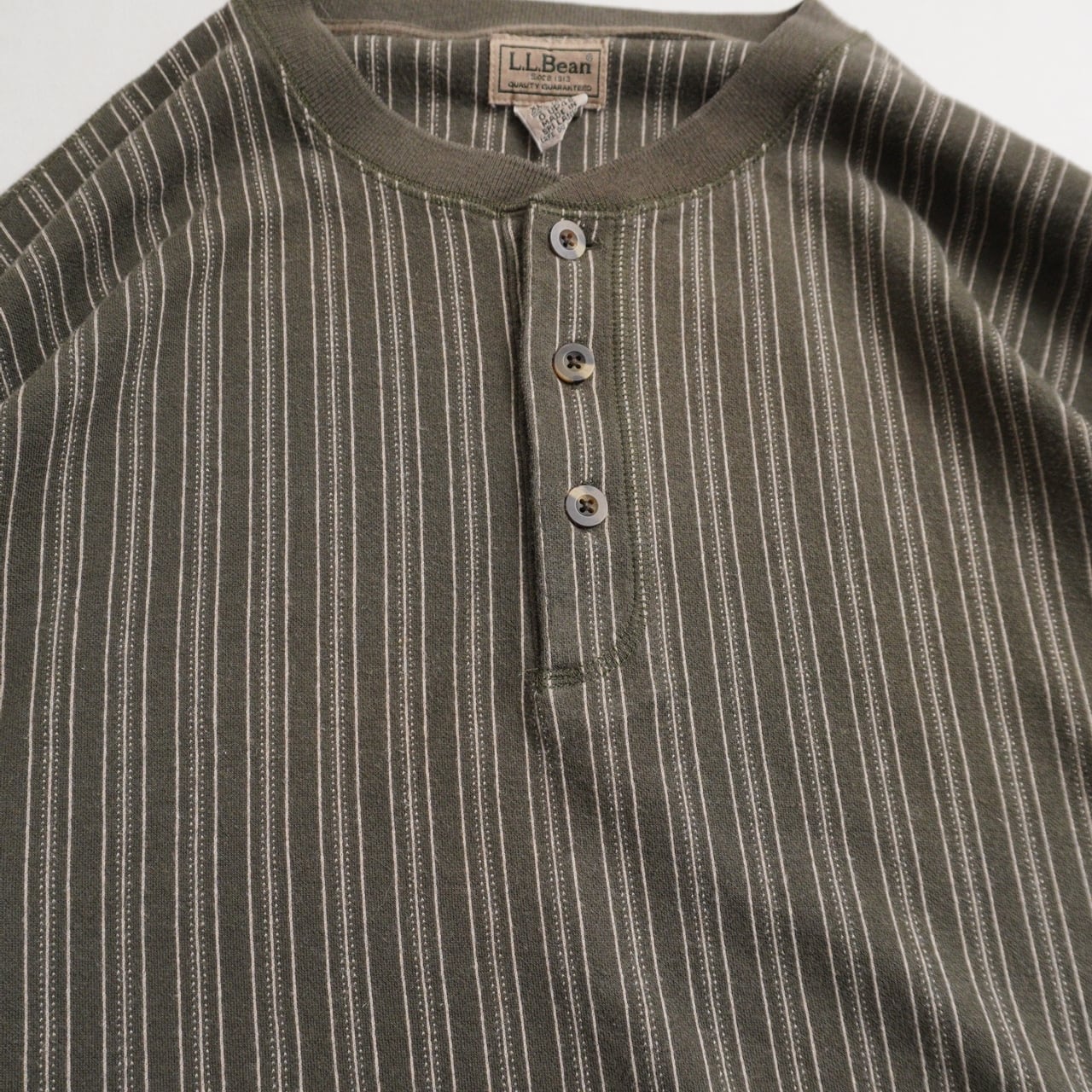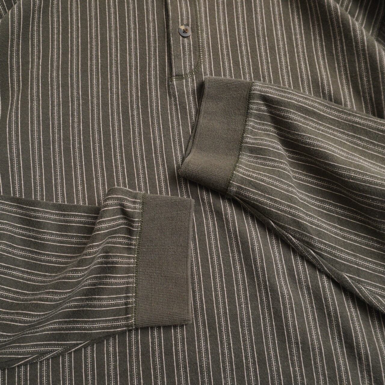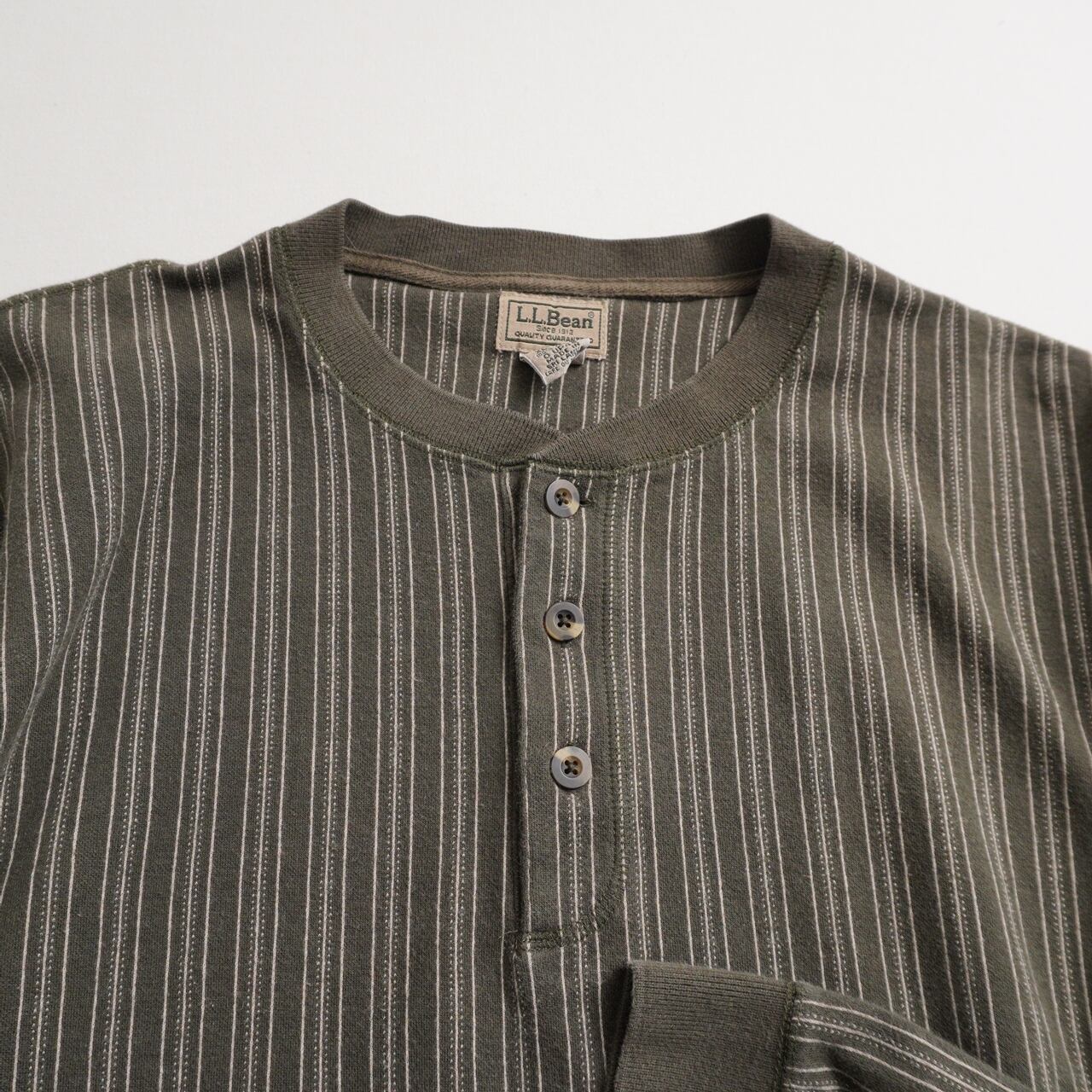 落ち着いたオリーブカラーに、細ピッチのピンストライプが映えるL.L.Beanのヘンリーネック。