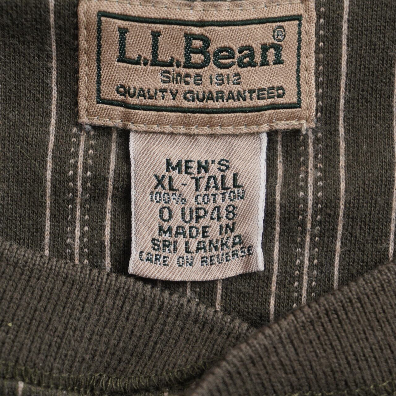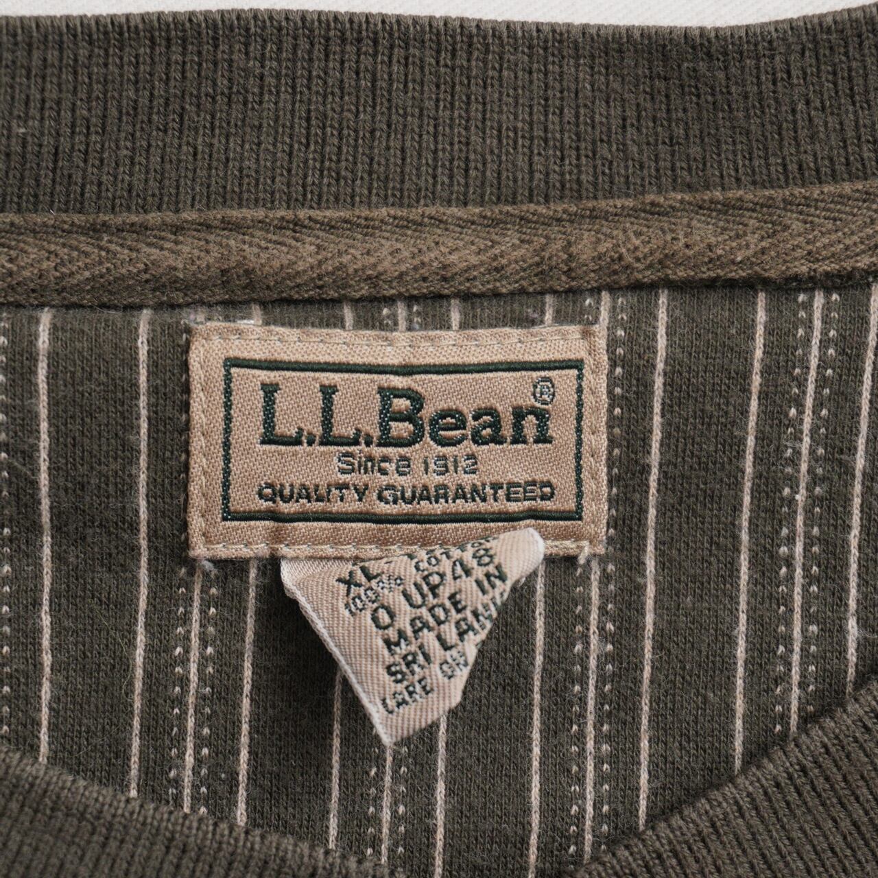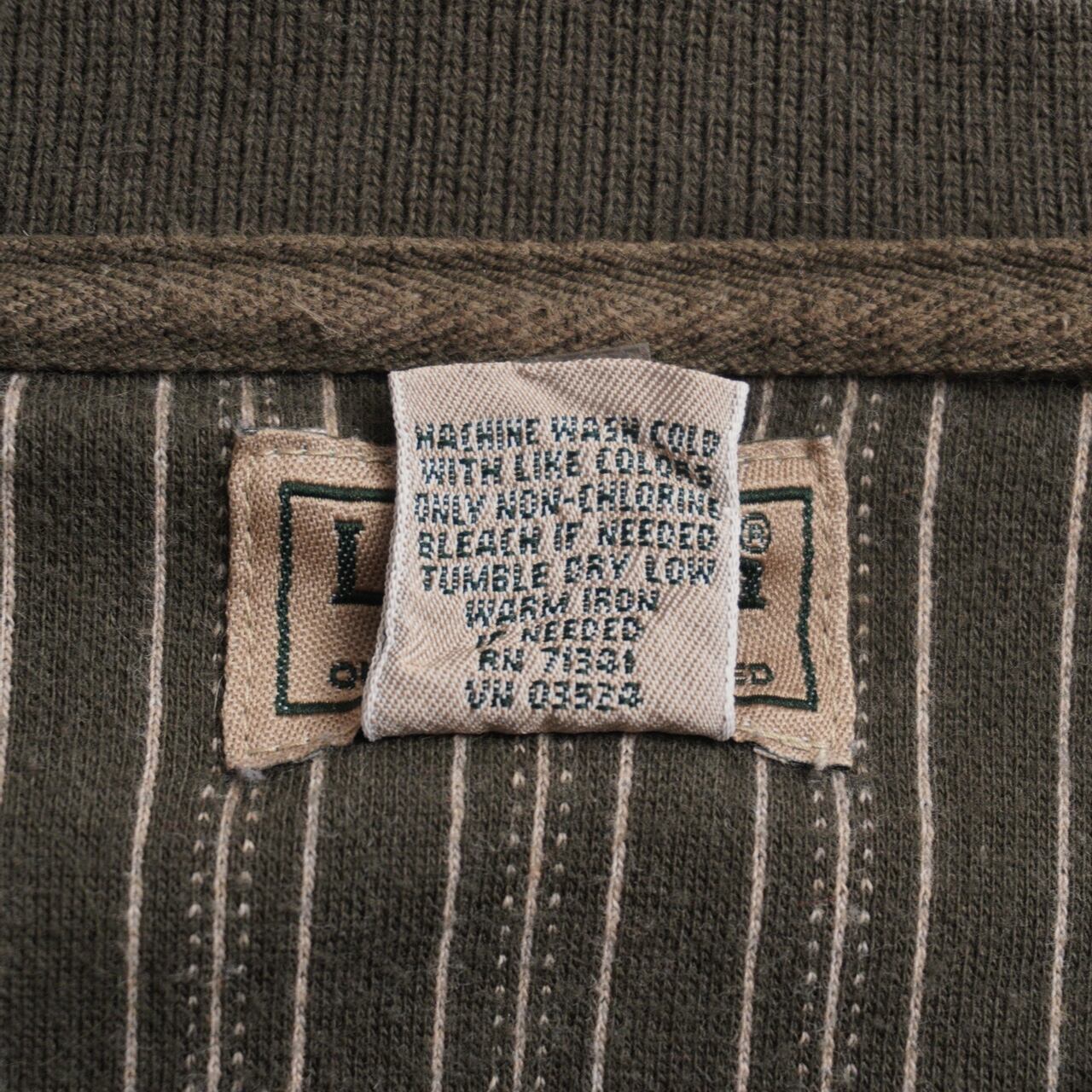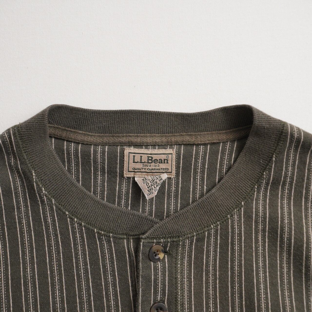 落ち着いたオリーブカラーに、細ピッチのピンストライプが映えるL.L.Beanのヘンリーネック。