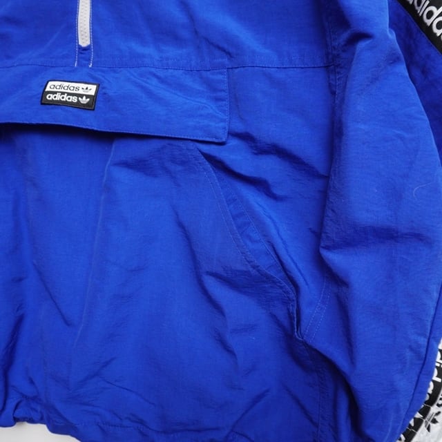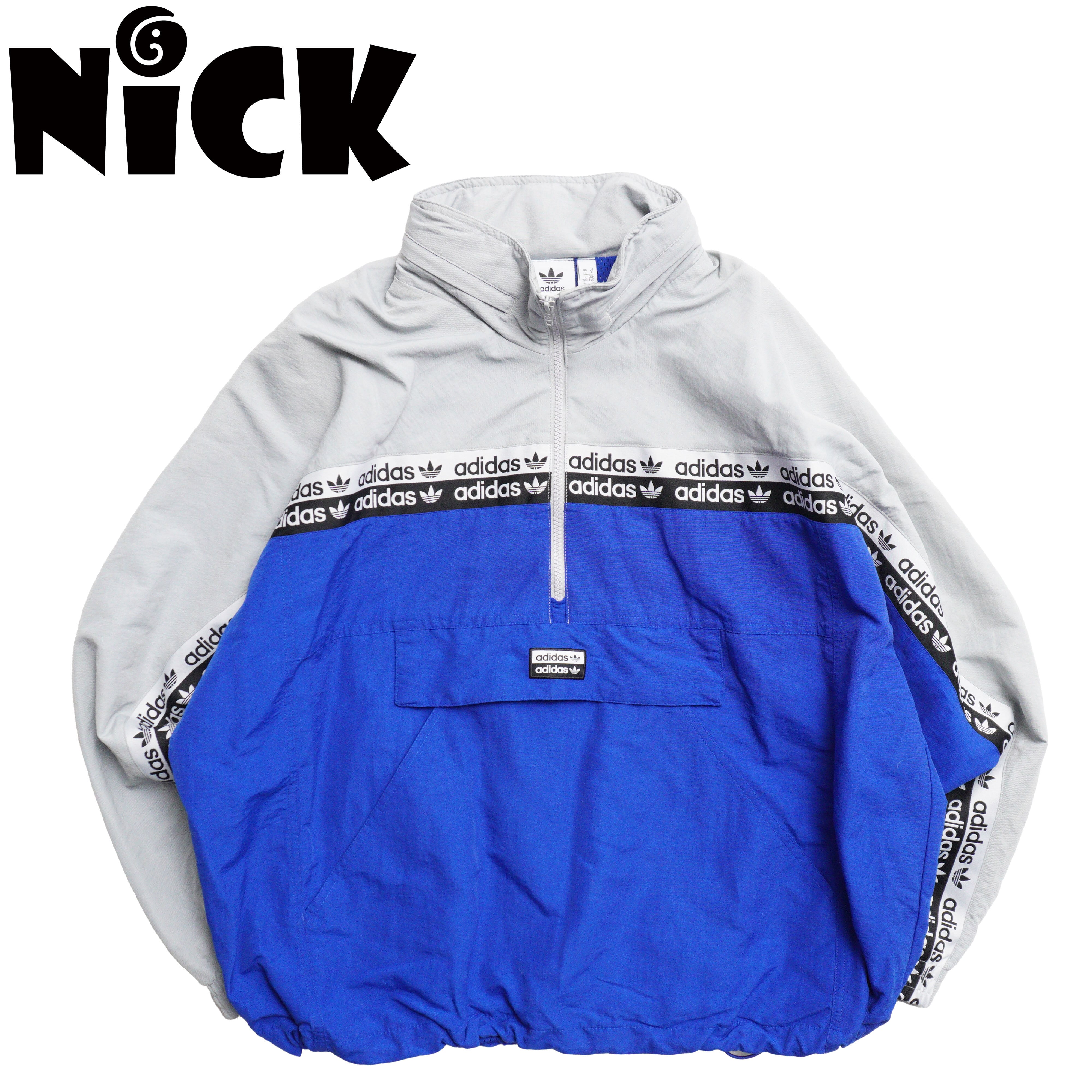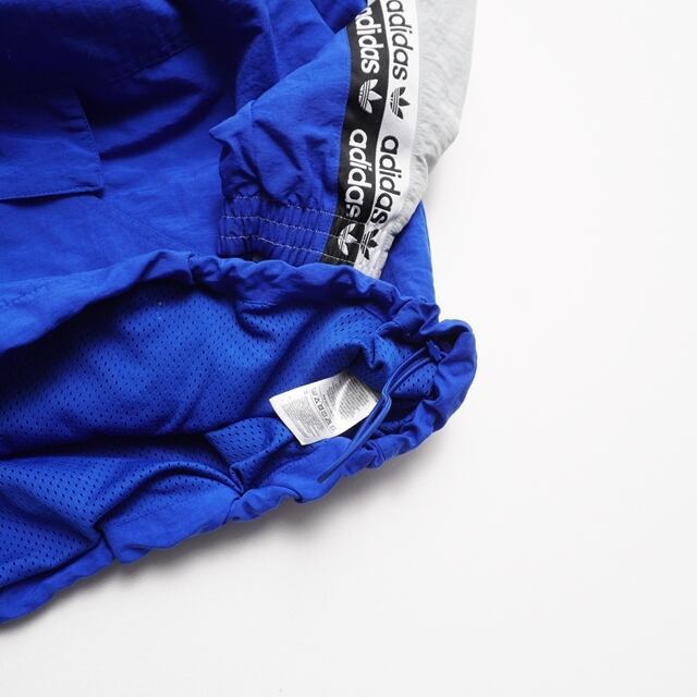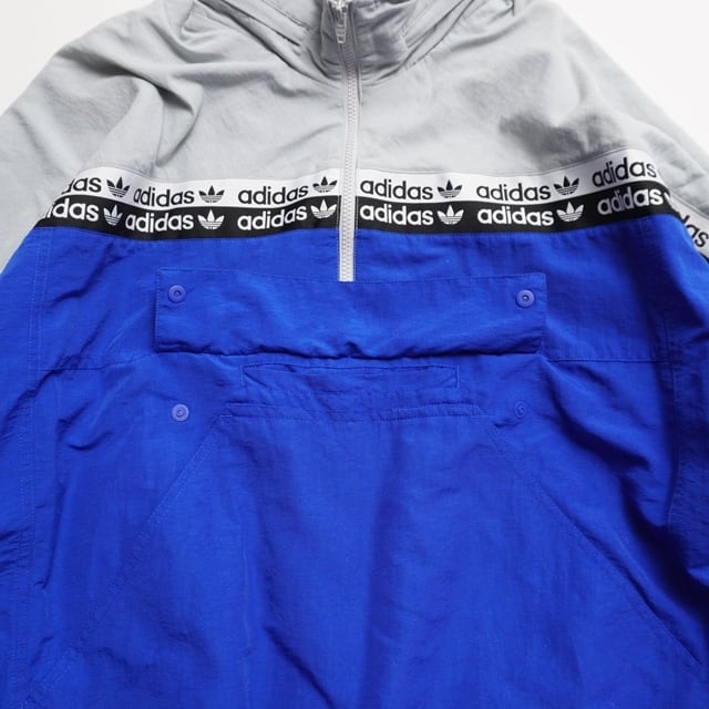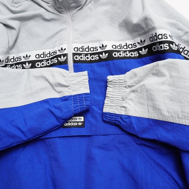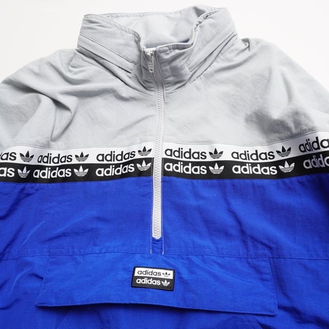adidas Originals ハーフジップ アノラックジャケット グレー×ブルー L ロゴテープ