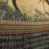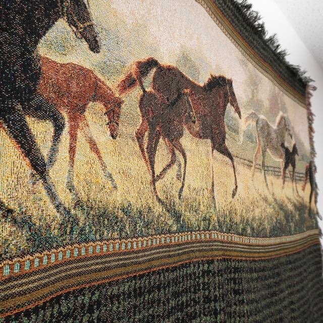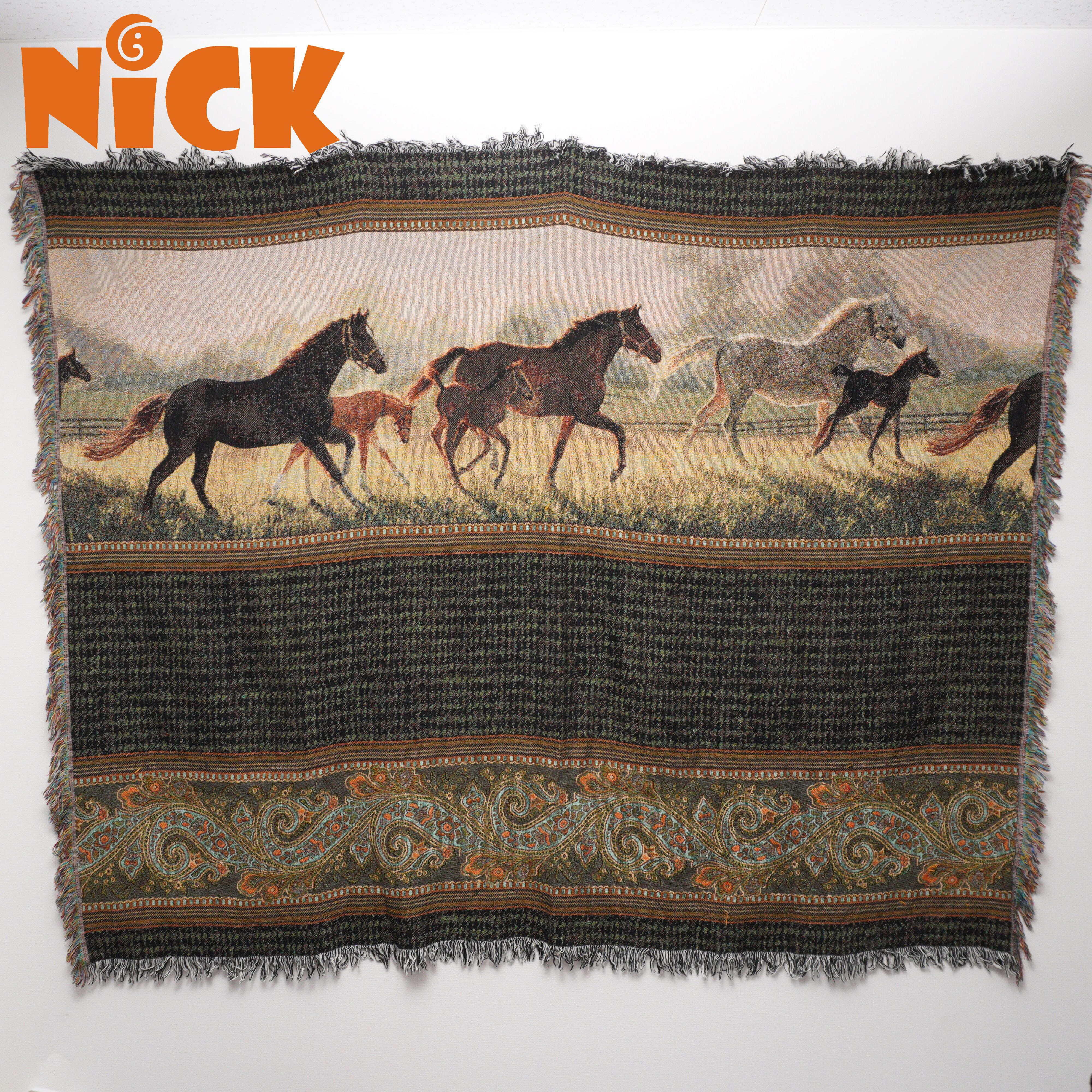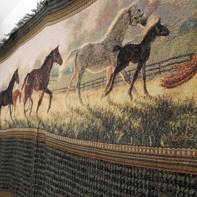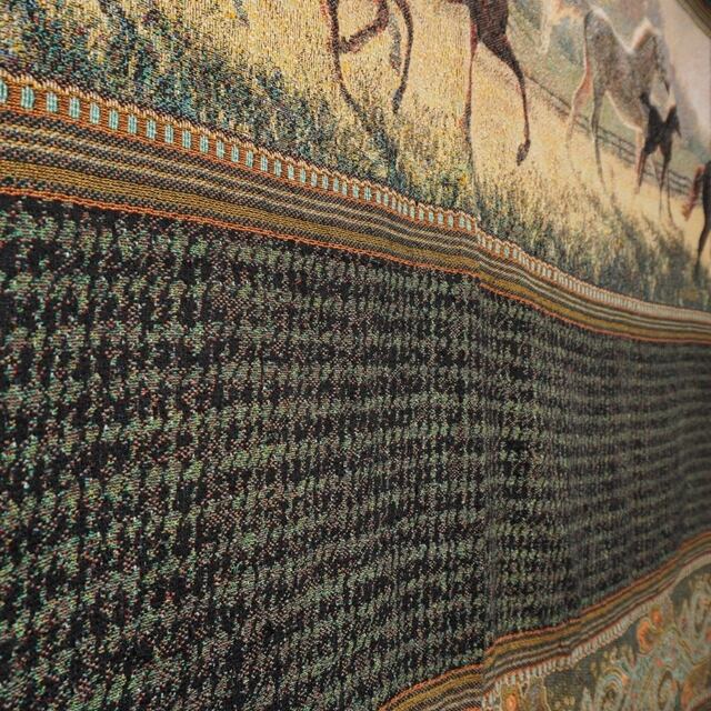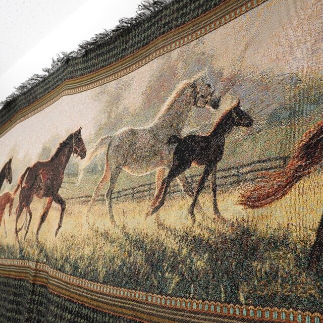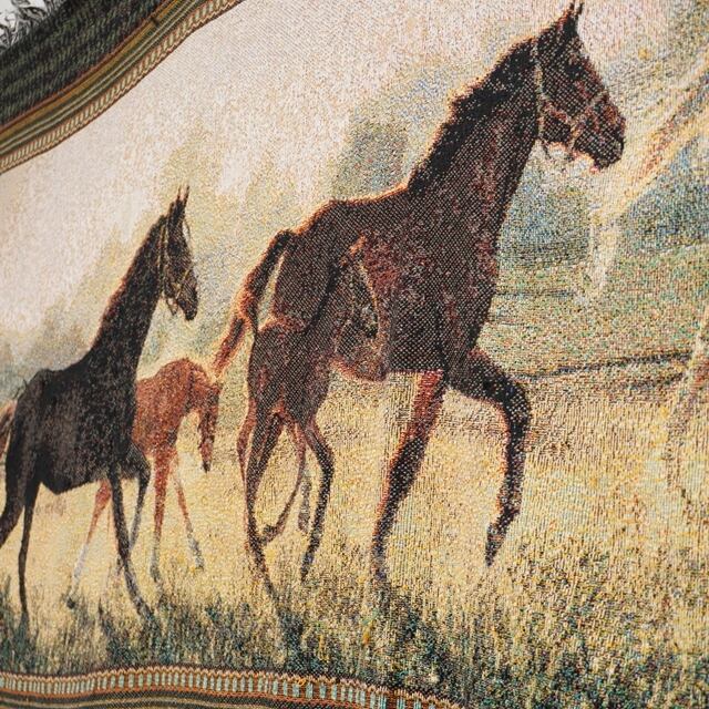 走る馬が描かれたデザインとペイズリー柄が印象的なラグ。