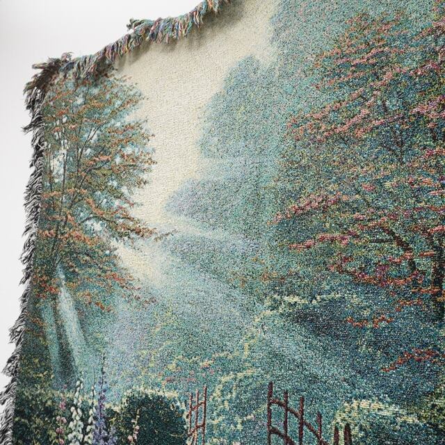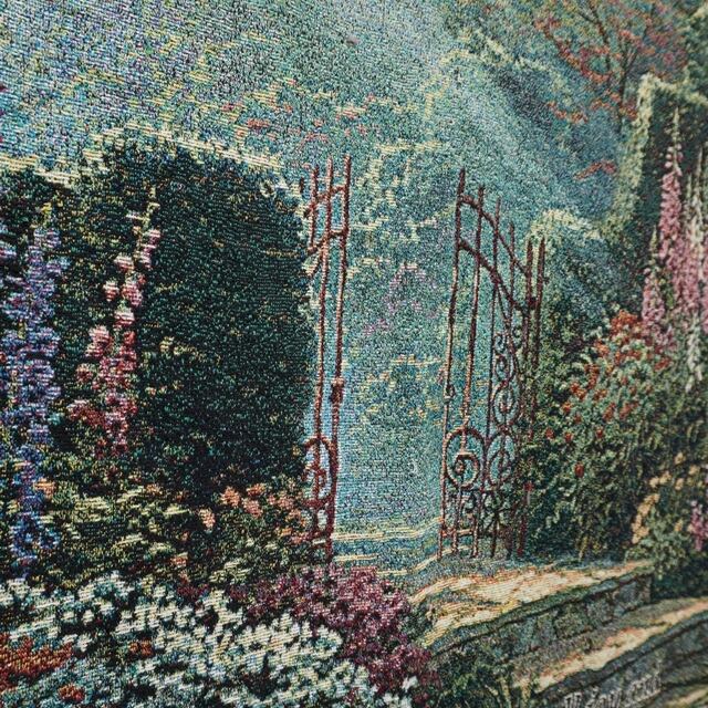 花々に囲まれた庭園と光の表現が印象的な、トーマス・キンケードの作品を思わせるデザインラグ。