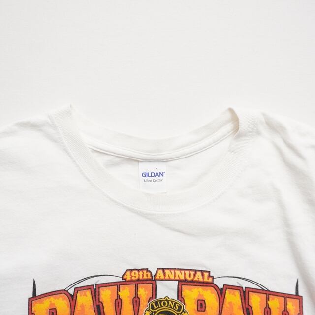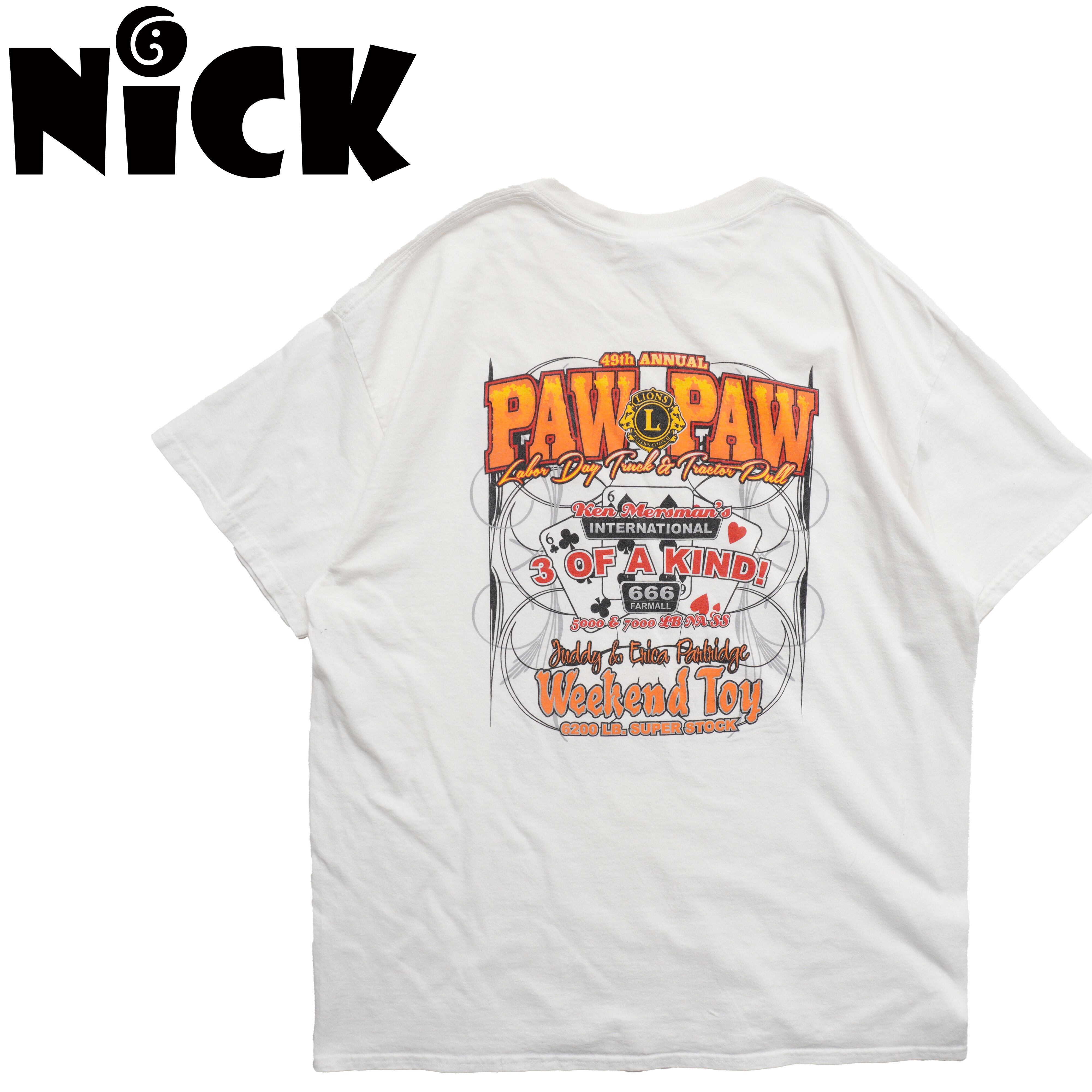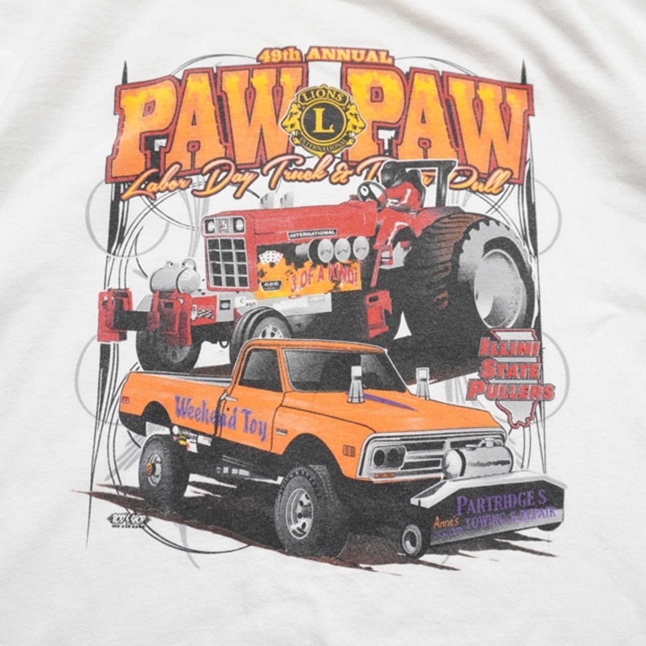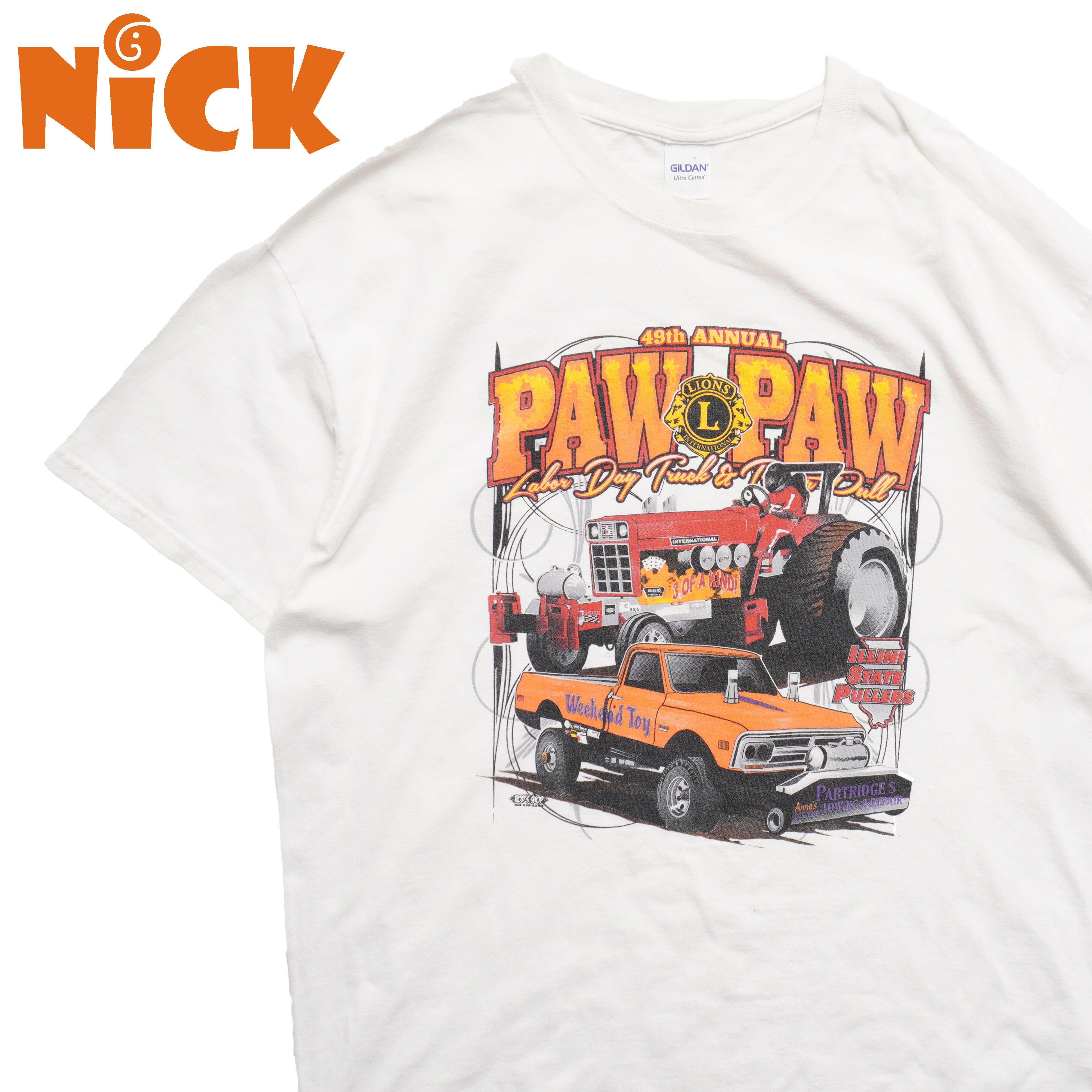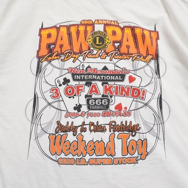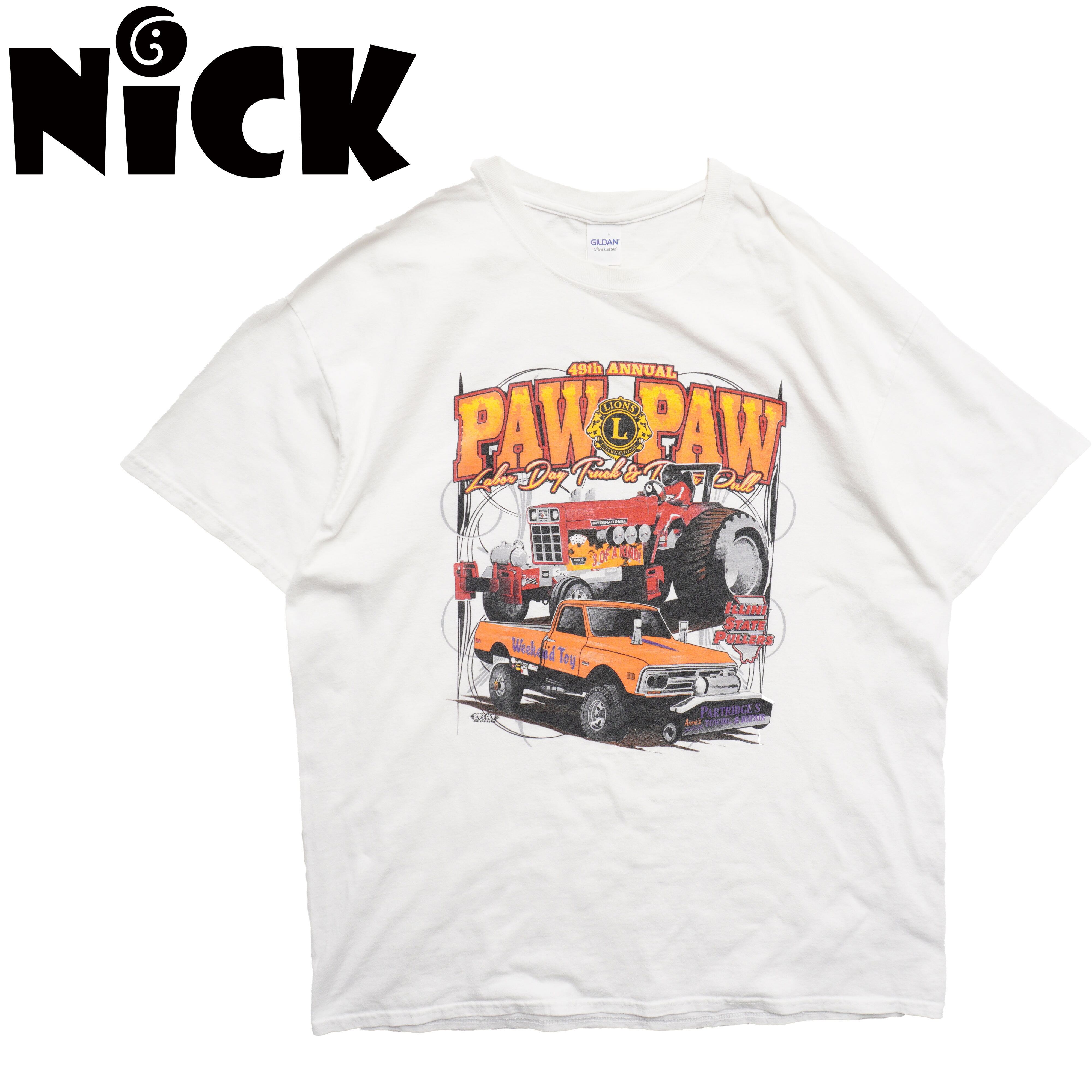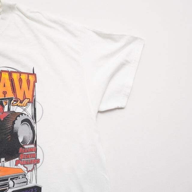 ホワイトボディにトラクター&ピックアップのパワフルなグラフィックが映える一枚。アメリカンイベント感あるデザイン。